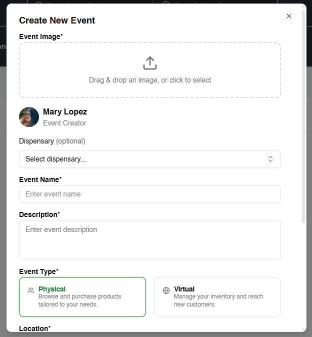 (Optional) Link a dispensary. Use the Dispensary dropdown to associate the event with a shop.