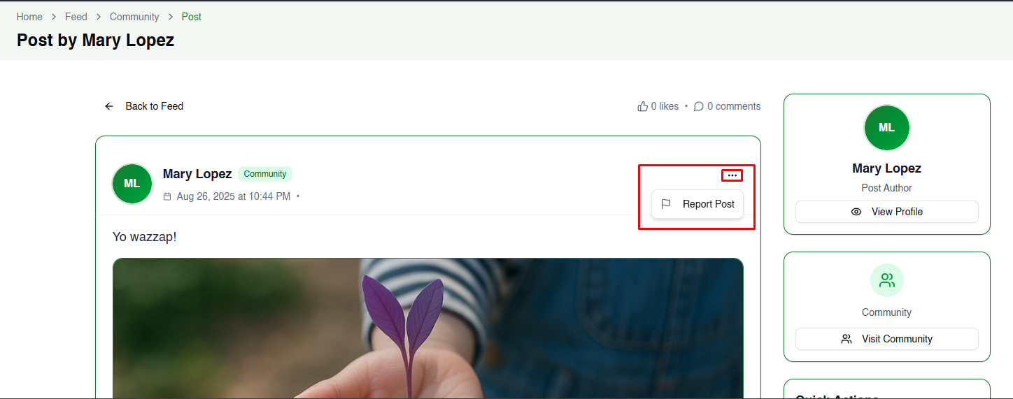 On the post page, look for the three‑dot menu (⋯). Click it and select Report Post from the dropdown.